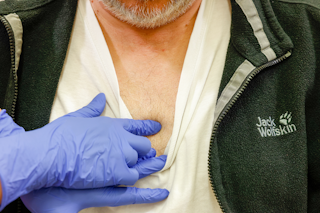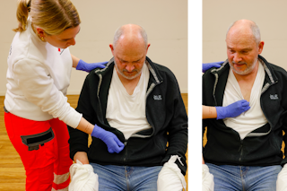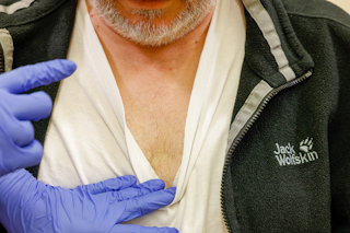 Abbildung: Rekapillarisierungszeit Brustbein bestimmen - Schritt 2 | Oberkörper des Patienten soweit entkleiden, daß Brustbein sichtbar |