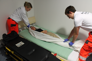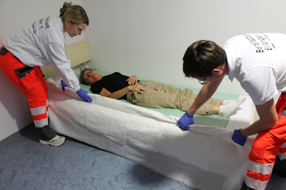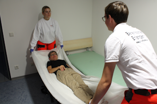 Helfer 1 und Helfer 2 Umbettlaken mit Patienten vorsichtige vom Bett auf Trage, beziehungsweise von Trage auf Bett ziehen