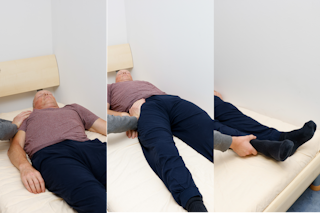 das oben liegende Bein des Patienten so ausrichten, dass der Oberschenkel im rechten Winkel zur Hüfte liegt