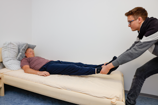Abbildung: Seitenlage Bett DRK 2017 herstellen - Schritt 12 | während die Hand des Patienten weiterhin gegen die Wange gedrückt gehalten wird, durch Ziehen am entfernt liegenden Bein Patienten auf die Seite rollen |