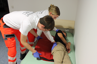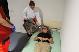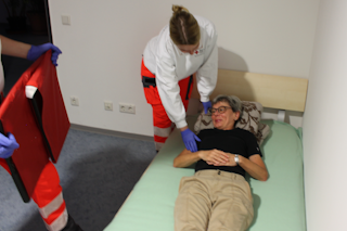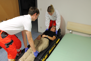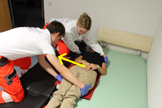 Helfer 1 und Helfer 2 Patienten vorsichtige über Rollbrett vom Bett auf Trage, beziehungsweise von Trage auf Bett ziehen