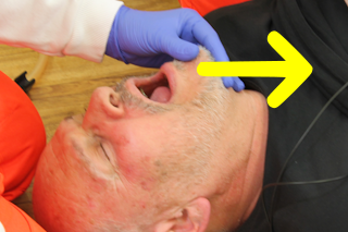 Abbildung: i-gel Maske einführen - Schritt 5 | Kinn des Patienten vorsichtig fußwärts neigen, um Mund vollständig zu öffnen |