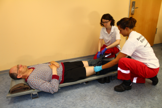 Aa | Deutsches Rotes Kreuz (Hg.): DRK Leitfaden Sanitätsdienstausbildung (2023): Berlin: 2023, Praxisanleitungen 'P E-9: Verbände im Sanitätsdienst - Unterkörper entkleiden', Seite 1. |