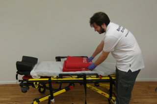 gegebenenfalls Patienten auf Unterlage sichern (zum Beispiel Gurte Krankentrage)