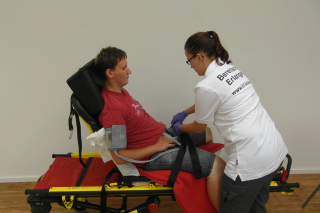 gegebenenfalls Patienten auf Unterlage sichern (zum Beispiel Gurte Krankentrage)