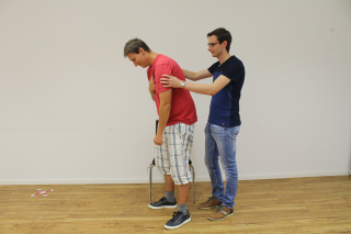 Abbildung: schwere Atemwegsverlegung (Erwachsener) - Schritt 3 | etwas seitlich hinter den Patienten treten |