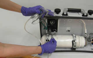 wenige Sekunden warten, bis sich gesamtes Schlauch-Masken-System mit Sauerstoff gefüllt hat