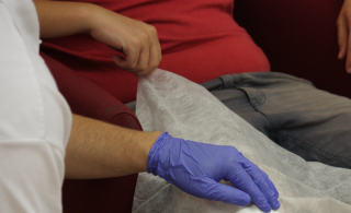 Abbildung: Knieverband mit offenem Dreiecktuch - Schritt 3 | Patienten bitten betroffenes Bein in Neutralposition (abgewinkelter Unterschenkel, sitzender Patient) zu bringen |