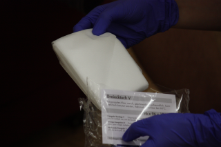 Mullkompresse patientennah aus Verpackung entnehmen und dabei nur an einer Ecke anfassen