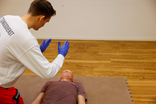 Abbildung: Trapezklemme - Schritt 1 | an Patienten von vorn herantreten, damit Patient Kopf nicht zur Seite dreht |