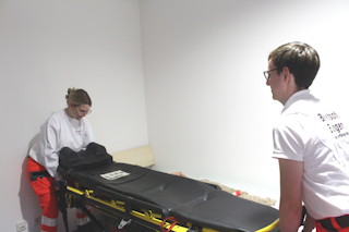 Wenn möglich sollten die Helfer das Prinzip 'Höhengefälle' nutzen, das heißt das Bett / Trage mit dem Patienten etwas höher stellen und den Patienten bergab statt bergauf ziehen. [1]