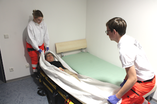 Helfer 1 und Helfer 2 Umbettlaken mit Patienten vorsichtige vom Bett auf Trage, beziehungsweise von Trage auf Bett ziehen