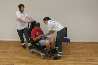 gegebenenfalls Patienten auf Sitzgelegenheit sichern (zum Beispiel Sicherheitsgurt Krankenwagentragestuhl)