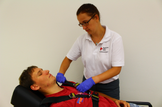 gegebenenfalls Patienten auf Unterlage sichern (zum Beispiel Gurte Krankentrage)