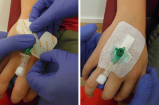 Venenverweilkanüle mit Kanülenfixierpflaster fixieren (lokale Prozedur beachten)