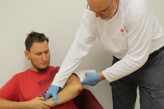 Verband sitzt in der Ellenbeuge zu fest. Beim Anwinkeln des Armes kommt es dann zu Stauung.