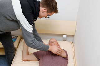 während die Hand des Patienten weiterhin gegen die Wange gedrückt gehalten wird, durch Ziehen am entfernt liegenden Bein Patienten auf die Seite rollen