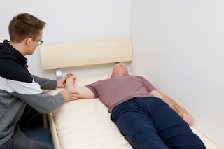 das oben liegende Bein des Patienten so ausrichten, dass der Oberschenkel im rechten Winkel zur Hüfte liegt