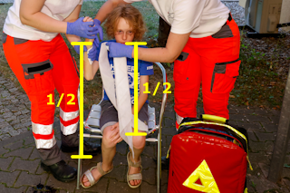 Abbildung: Druckverband anlegen - Dreiecktuchkrawatte (DRK SAN 2023) - Schritt 9 | verbundenes Körperteil nach Möglichkeit hochlagern |
