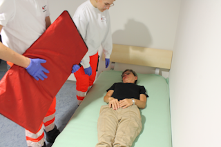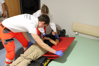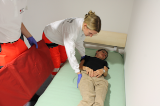 Helfer 1 und Helfer 2 Patienten vorsichtige über Rollbrett vom Bett auf Trage, beziehungsweise von Trage auf Bett ziehen