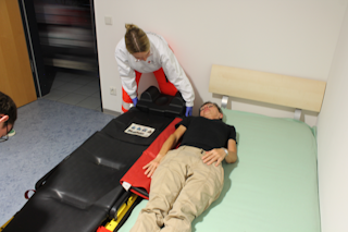 Wenn möglich sollten die Helfer das Prinzip 'Höhengefälle' nutzen, das heißt das Bett / Trage mit dem Patienten etwas höher stellen und den Patienten bergab statt bergauf ziehen. [1]
