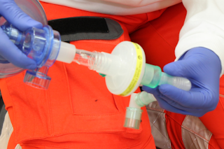 Abbildung: i-gel Maske Beatmung durchführen mit elektronische CO2-Messung - Schritt 1 | Sauerstoff mit maximalem Flow (15 l/min oder Demand-Ventil) an Beatmungsbeutel anschließen |