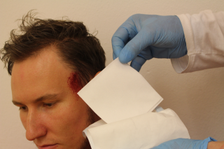 Abbildung: Kopfverband Schläfe mit Dreiecktuch - Schritt 4 | Mullkompresse auf Wunde legen |