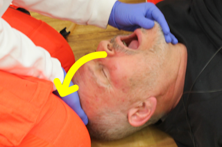 Abbildung: i-gel Maske einführen - Schritt 5 | Kinn des Patienten vorsichtig fußwärts neigen, um Mund vollständig zu öffnen |