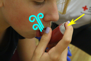 Abbildung: Medikamentengabe Fenoterol - Schritt 6 | Patienten langsam und tief einatmen lassen und gleichzeitig Spraygabe auslösen |