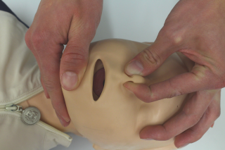 Abbildung: Atemspende Kind durchführen - Schritt 5 | mit Daumen und Zeigefinger der auf der Stirn liegenden Hand die Nase des Patienten durch zusammendrücken der weichen Nasenflügel verschließen |