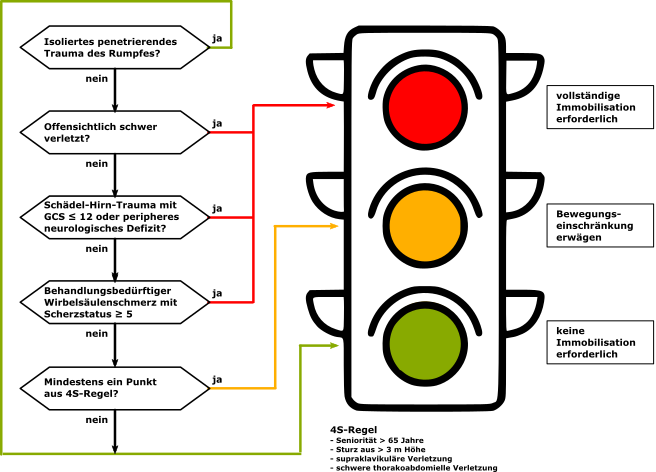 Die Immo-Ampel sieht vor, dass offensichtlich Schwerverletzte mit stumpfen Verletzungen, schwerem Schädel-Hirn-Trauma, peripher-neurologischen Symptomen oder behandlungsbedürftigen Wirbelsäulenschmerzen zu immobilisieren sind.