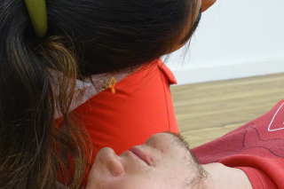Abbildung: Atemwege mit Unterkiefer Griff freimachen (Erwachsener) - Schritt 8 | das eigene Ohr dicht über den Mund und Nase des Patienten halten |