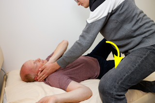 während die Hand des Patienten weiterhin gegen die Wange gedrückt gehalten wird, durch Ziehen am entfernt liegenden Bein Patienten auf die Seite rollen