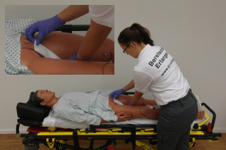 gegebenenfalls Patientin auf Unterlage sichern (zum Beispiel Gurte Krankentrage)