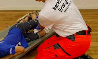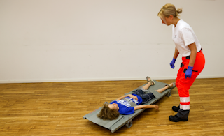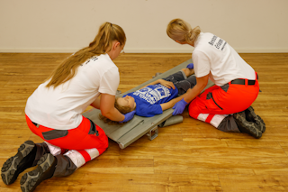 Praxisanleitung: Seitenlage - Erwachsener auf Trage herstellen (DRK 2023)